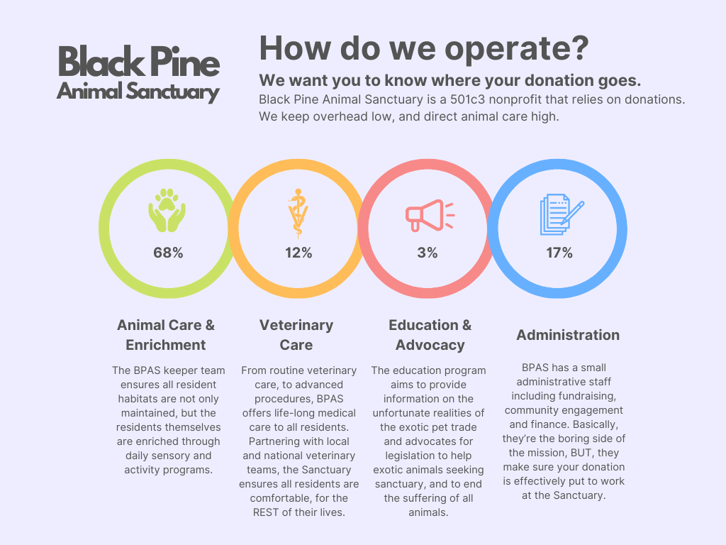 Nestled on 18 acres in Albion, IN, Black Pine Animal Sanctuary is the forever home to over 80 captive raised exotic and wild animals. In 2019, BPAS became the only multi-species Global Federation of Animal Sanctuaries (GFAS) accredited sanctuary in the state of Indiana. The sanctuary offers over ½ mile of paved trails with habitats for wolves, foxes, tigers, bobcats, and bears. In addition to the outdoor habitats, Black Pine hosts a Primate House, Reptile House, and Avian Building. As a true sanctuary, Black Pine Animal Sanctuary does not buy, sell, trade, or breed the animals living here. The animals living at BPAS have refuge here for the REST of their lives. Most of the animal residents were voluntarily surrendered, however some were removed by legal authorities.